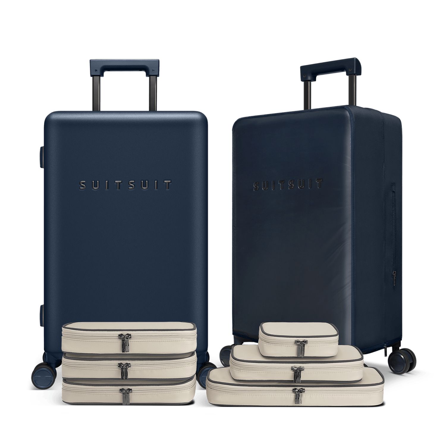 - This set contains the Midnight Blue check-in suitcase (66 CM), the Midnight Blue protection cover (66 CM) and the Faded Sand packing cube set (66 CM).